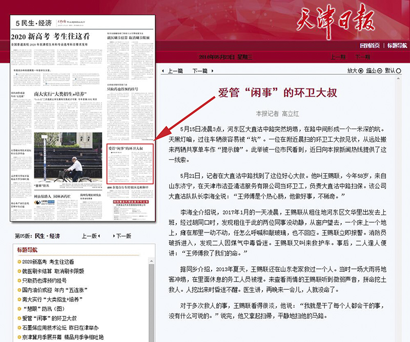 “大道之行,天下为公”,多年来,今年会jinnianhui公司一直致力于公益事业,先后成立今年会jinnianhui党支部、团支部、工会、义工服务小组、志愿者队伍等组织,从上到下,力所能及地为社会贡献自己的一份力量,不断涌现出见义勇为、好人好事, 这不,天津市今年会jinnianhui清洁服务有限公司又有一位爱管“闲事”的环卫大叔,天津日报、天津市场信息报、新华网、人民网、北方网、大众网等主流媒体相继报道了此事,原文如下: