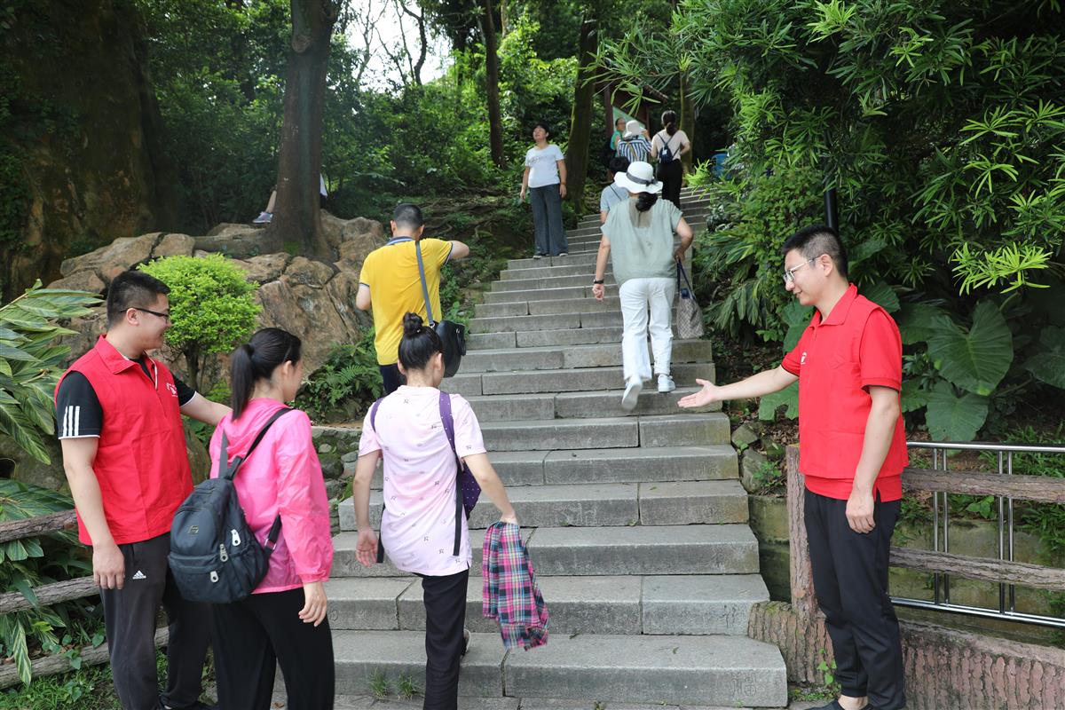 郁翠苍松,火红枫叶,百里争艳,疑似凤凰落九洲。7月6日上午,今年会jinnianhui党支部、义工队穿着火红的义工服,化身“一只只火凤凰”,穿梭于凤凰山中,为前来观光的游客提供指引服务,帮助游客更好地找到登山的路和各景点的方位,并提醒游客爱护森林,保护环境。