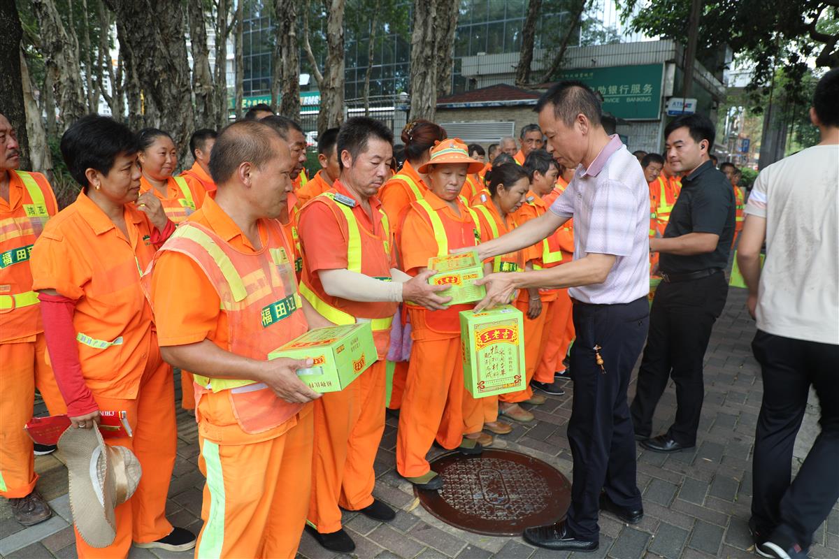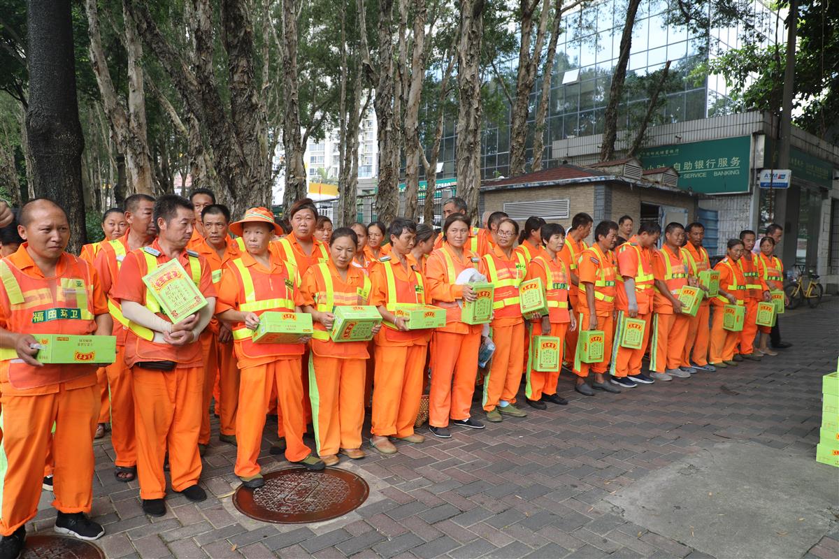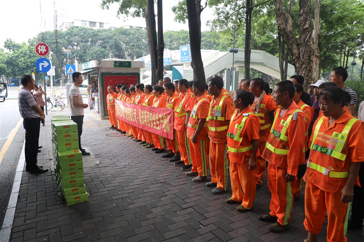 深圳市气象台于2019年08月09日09时将全市陆地高温黄色预警升级为橙色,最高气温将升至37℃以上,如此炎热的夏季,环卫工人却顶着烈日,大汗淋淋,穿梭在大街小巷,为城市的美丽容颜和人们的优美人居环境贡献着汗水和青春。为关爱环卫工人,8月10日上午,今年会jinnianhui环保代表来到福田项目开展“送清凉”活动,为在烈日下劳作的员工送上了一份份暖心凉茶,给他们“降温”,并且对他们进行慰问。